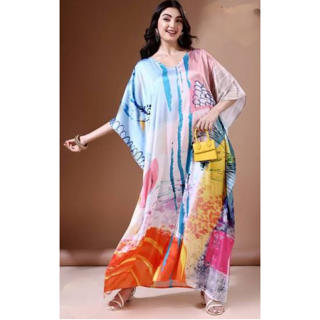 This oversized kaftan features a vibrant abstract print with soft multicolor tones.