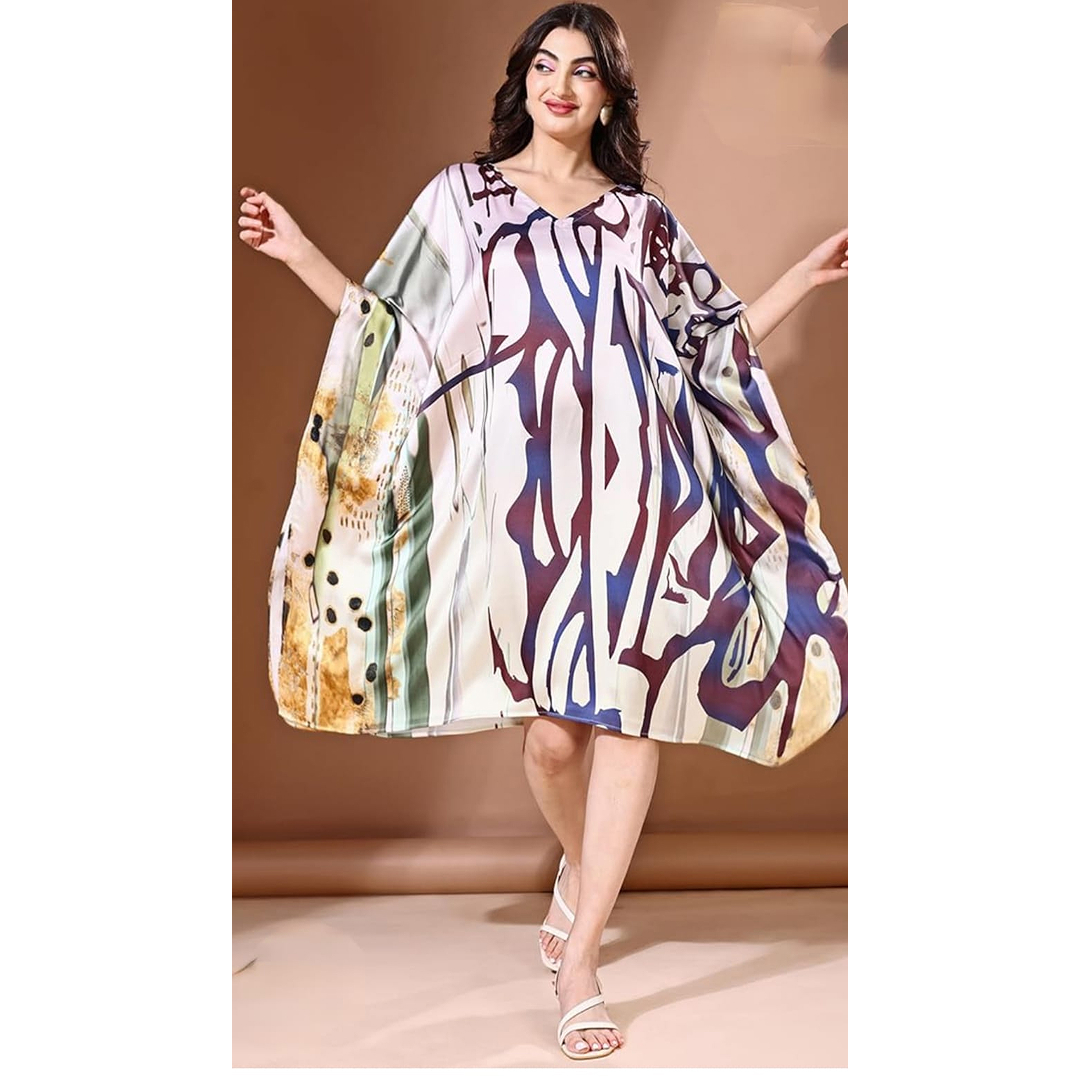 This oversized kaftan features bold abstract patterns in earthy tones.