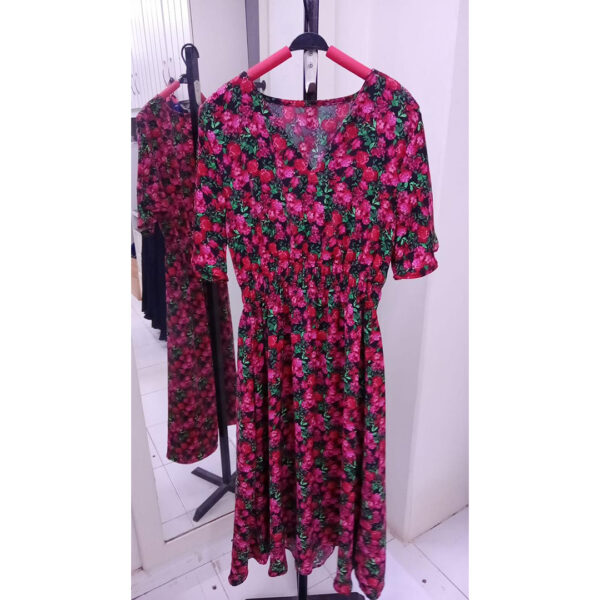 This midi dress features rich pink floral prints on a soft dark base.